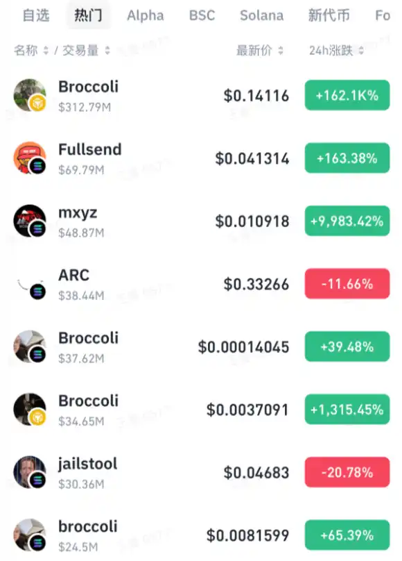 不过最终 Bounce Brand 的代币并没有成为「西兰花龙头」。Binance Web3 钱包热门项目(此前有「CZ's Dog」项目,目前已被删除)显示,截至撰稿,Broccoli 系代币中市值最高的目前只有 3 亿美元。尽管市场参与度很高,但目前尚未形成高度共识的龙头项目。