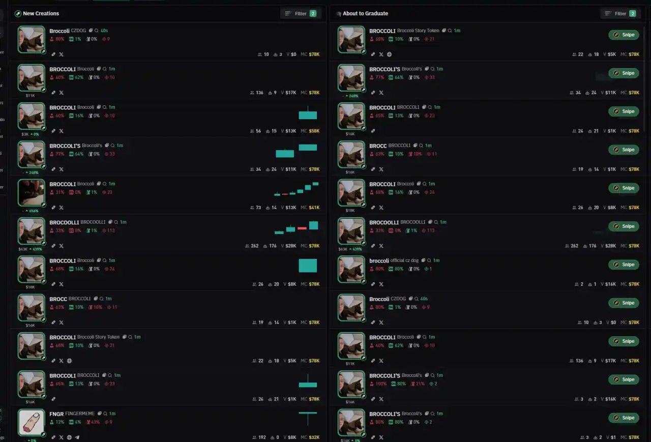 由于 CZ 并未公布官方代币合约地址,一时间大量同质化代币在 BNB Chain 上同时发出,顶着同样的图片和名字刷屏新币看板,足以见其声势浩大和 PVP 之激烈。