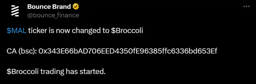 除了大量匿名 Dev,Bounce Brand 官方的参与继续将这场「西兰花」热推向高潮。13 日晚间,Bounce Brand 官方发布了一个新的代币,最初是根据 CZ 的比利时马林诺斯犬(Belgian Malinois)命名为$MAL,但在 CZ 公布了自己爱犬的真实姓名后,Bounce Brand 将已经发射了的$MAL 代币改名为$BROCCOLI,并附上了 BNB Chain 上的合约地址。