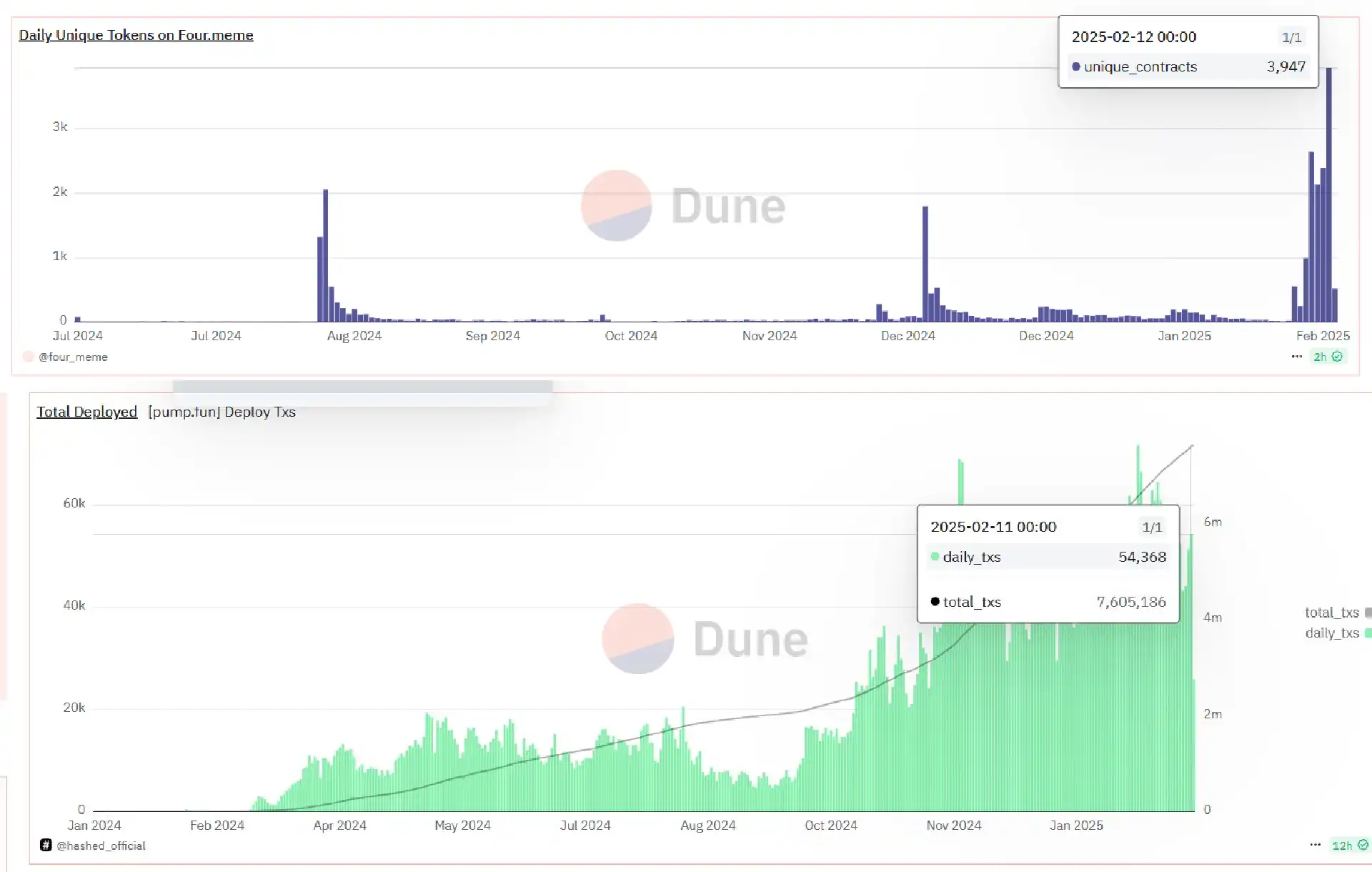 KOL Defi_Mochi(@defi_mochi)在 Twitter 上披露了一份来自 dune 的统计数据,展示了 four.meme 平台和 pump.fun 平台的代币部署情况。数据显示,在 four.meme 平台共有 31,162 个代币被创建,每日创建的代币数量为 3,947;在 pump.fun 平台共有 7,605,186 个代币被创建数量,每日创建的代币数量为 54,368。