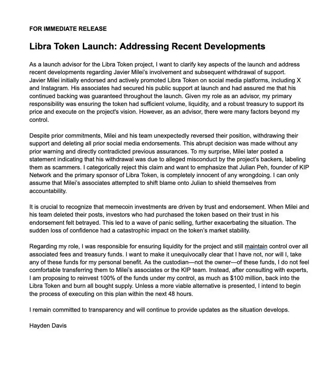 2 月 16 日早晨 8 时,Hayden Davis 发布了一支三分钟的澄清视频和相关公告,他在视频中主要传达的信息有以下几点:
