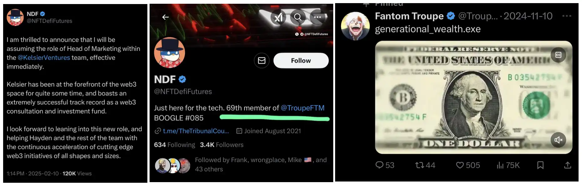 而加密 KOL NDF 既是 Kelsier Ventures 的团队成员,同时也是 Fantom Troupe 的一员,这解释了 LIBRA 的提前消息是如何流入内部小圈子的。相当于华尔街的一名并购(M&A)投资银行家,同时在同一家公司里兼职日内交易员,明显存在利益冲突。