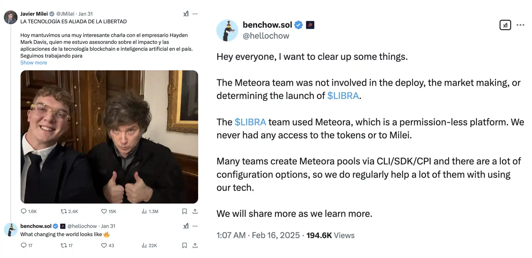 在 1 月 31 日 Milei 总统发布的与 Hayden Davis 会面推文评论区中,Meteora 创始人曾评论道「改变世界的模样」,被社区作为 Meteora 也曾参与 LIBRA 内部谋划的佐证。因此,Meteora 创始人 Ben 甚至尚未在 Hayden Davis 发布视频之前就发布了澄清声明,表示 LIBRA 团队使用了 Meteora 这个无许可平台,但 Meteora 从未掌控过任何代币,也没有与 Milei 有任何直接接触。