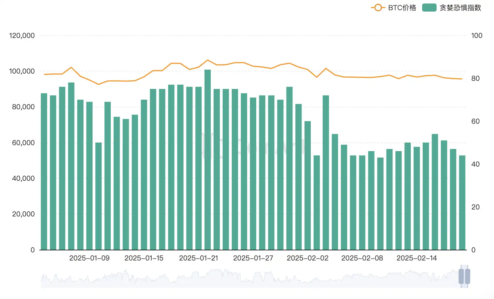 近一周以来,BTC 长时间在 94,000 美元-99,000 美元的区间内窄幅震荡,而 2 月 18 日的美盘时间迅速下杀至 93,300 美元,在链上也出现了巨鲸的巨额清算:某鲸鱼在 BTC 向下跌破 94,000 美元后被清算了 1400 万美元的 WBTC。恐惧贪婪指数也从 2 月 7 日以来持续表现为情绪的恐惧水平。