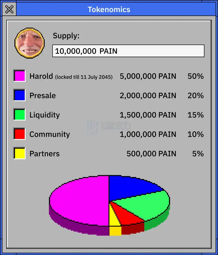 其代币经济模型显示,PAIN 总供应量为 1000 万枚,其中 50% 分配给 Harold 本人、20% 用于预售、15% 用于流动性、10% 分配给社区、5% 分配给合作伙伴。