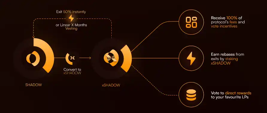 Shadow 采用了一种独特的玩家对玩家(PvP)方式,改进了传统的 ve(3,3) 反稀释模型,旨在既保护 xSHADOW 持有者免受稀释影响,又激励他们保持持仓并参与 SHADOW 的持续成功。在 xSHADOW 中停留更久的质押者会赚取更多的费用、投票激励、用户和排放退出奖励,用户可以随时退出其持仓,确保奖励流向那些最看重并持续参与它的人。这一机制不仅鼓励避免过早退出,还确保剩余参与者因忠诚和积极参与而获得奖励。