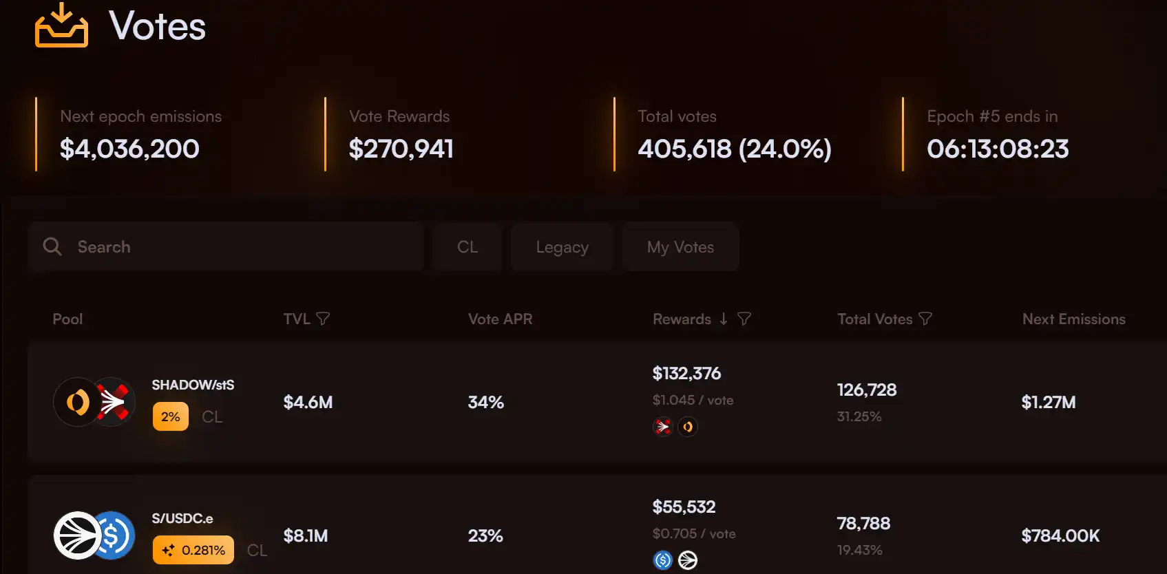 xSHADOW 持有者通过积极参与和投票获得奖励。当持有者通过量表投票支持流动性时,将按比例分享由该流动性产生的所有费用,以及协议为吸引参与而提供的额外投票激励。xSHADOW 代币的主要目的是通过投票将发放的代币奖励引导到增加流动性上,该部分代币奖励会按投票在该周期内的总百分比比例进行分配。例如,单个时期内分发 100,000 xSHADOW。如果所有投票的 10% 分配给 SHADOW / USDC 对,则该对将收到 10,000 xSHADOW 代币,这些代币将在整个时期内线性分配给相关 LP 对的流动性提供者。