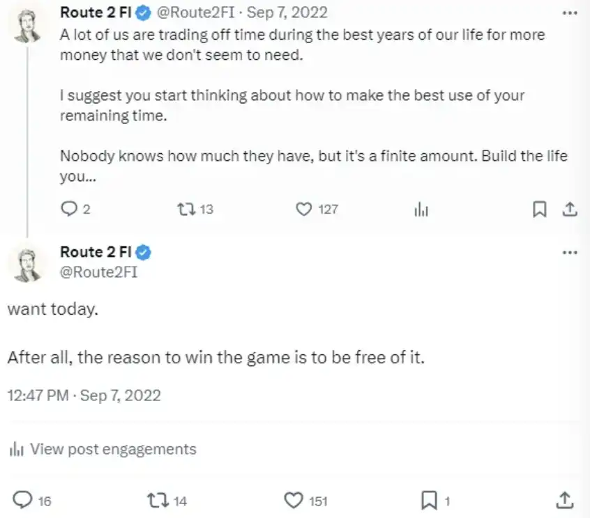 这个概念在《你的钱还是你的生活》一书中得到了普及。这本书实际上改变了我的一切,并最终引导我进入了加密 Twitter 的世界。