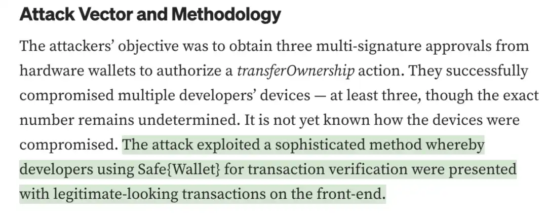在本次事件中,Safe 合约没问题,问题在非合约部分,前端被篡改伪造达到欺骗效果。这个不是个案。朝鲜黑客去年就以此方式攻击了好几个平台,如:WazirX 损失 $230M,为 Safe 多签;Radiant Capital 损失 $50M,为 Safe 多签;DMM Bitcoin 损失 $305M,为 Gonco 多签。这种攻击手法工程化成熟,需要多加注意。