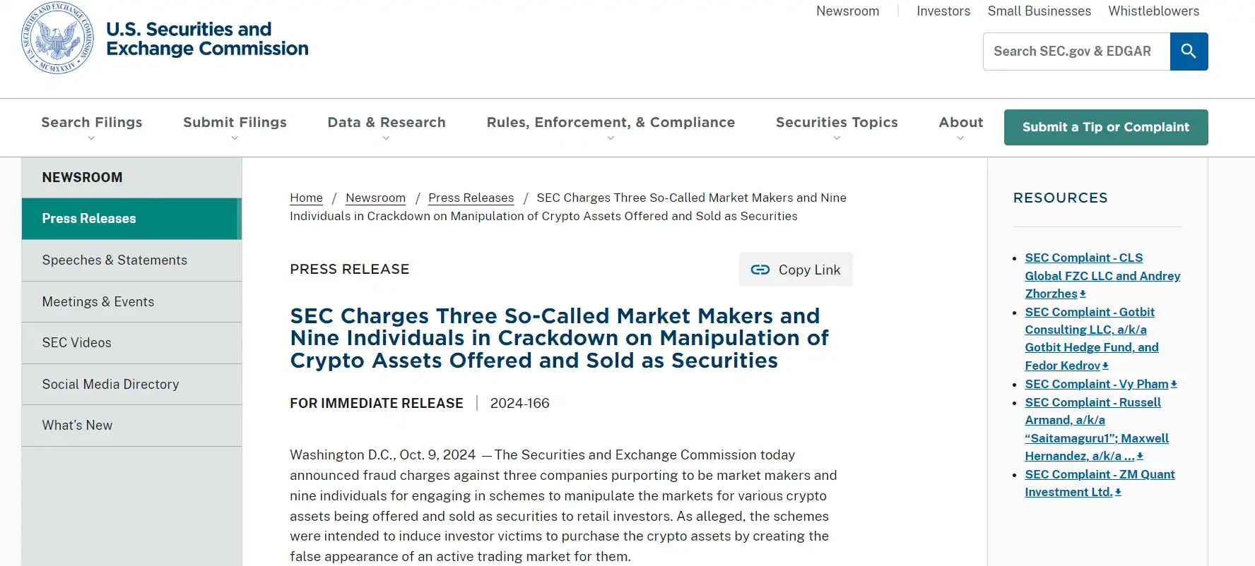 很长时间以来,美国对加密行业的监管都较为苛刻。在拜登政府时期,SEC 采取了严格的监管立场,将许多加密资产视为证券,这意味着做市商如果涉及这些资产,必须注册为经纪交易商,并遵守证券法的相关要求。这一要求也导致了大量诉讼纠纷的发生。例如,2024 年 10 月 9 日,SEC 对三家自称做市商的公司和九名个人提起欺诈指控,称他们参与了操纵各种加密资产市场的计划,通过为投资者创造活跃交易市场的假象来诱使其购买加密资产。