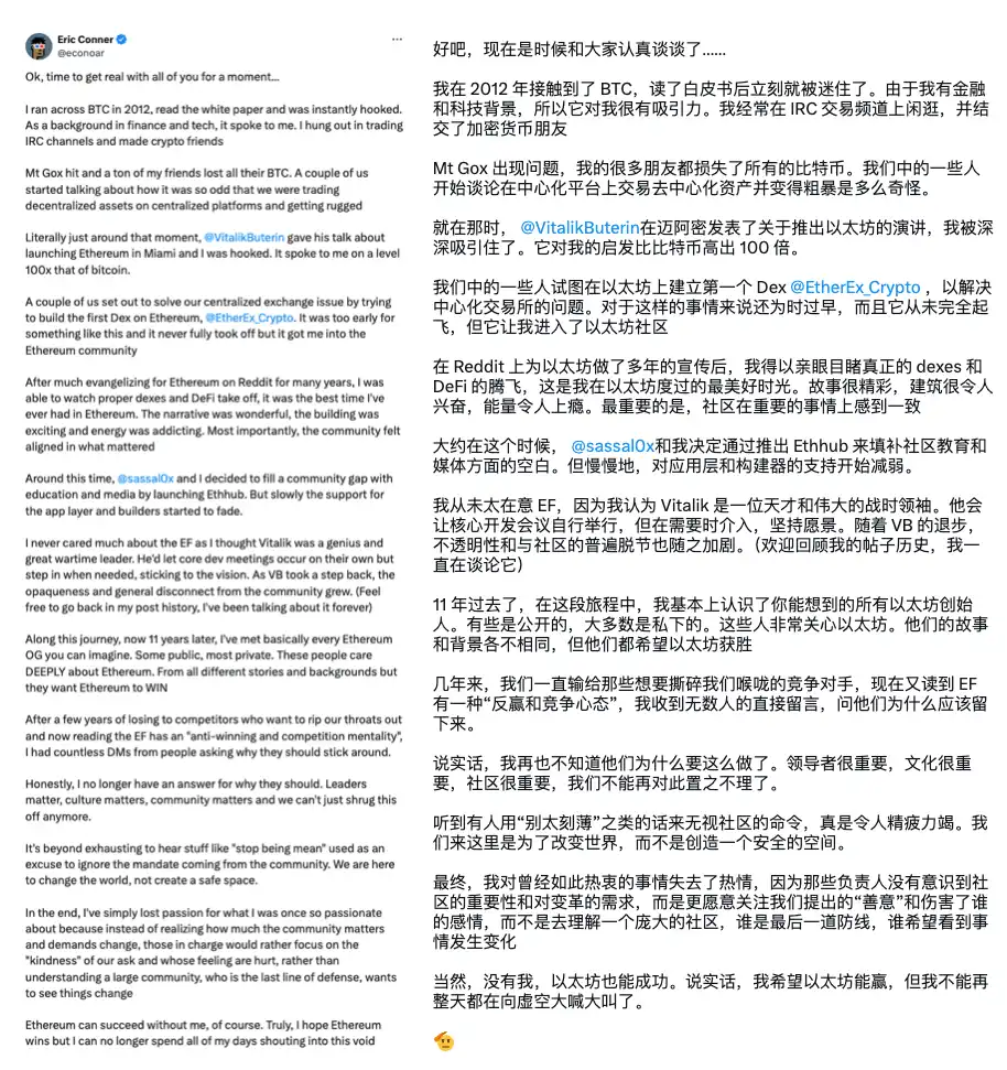 在社区情绪并不算好的时候,Vitalik 却总是强调 peace and love 的「左派风」又更惹恼了社区,甚至引起过以太坊早期开发 Eric 的不满:「听到有人用『别太刻薄』之类的话来无视社区的命令,真是令人精疲力竭。我们来这里是为了改变世界,而不是创造一个安全的空间。」