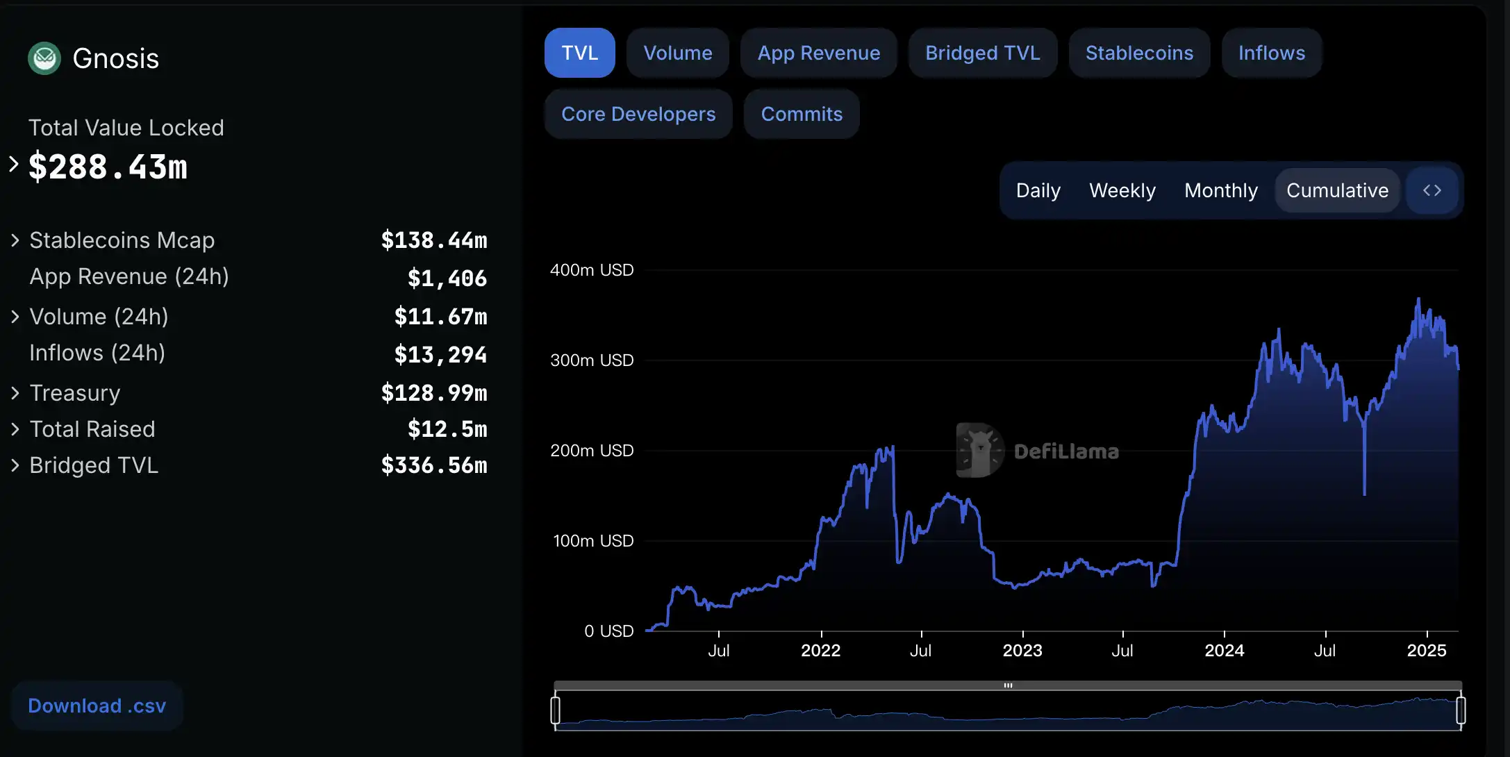 Gnosis Chain,这是上一轮周期里比较出名的以太坊侧链,专注于高效、安全的去中心化应用构建。根据 DefiLlama 数据,截至撰写本文时,Gnosis Chain 的锁仓总价值(TVL)是 2 亿美元,最高峰时期是 3.5 亿美元。
