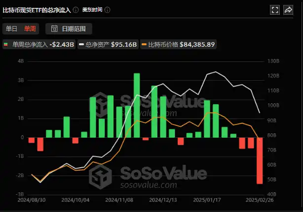 使情况进一步复杂化的是比特币 ETF 的大量资金流出,根据 Sosovalue 数据,比特币已连续实现净流出超 7 天,单日流出金额创下了创纪录的 10 亿美元,比特币 ETF 过去一周已实现净流出超 24 亿美元。这些撤资行动反映出机构投资者对短期市场走势的普遍不确定性。