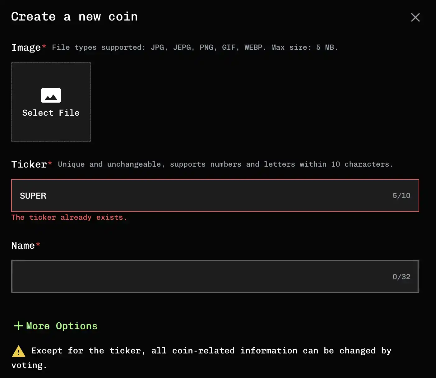 不只是 Super Curve 的创新,Super.exchange 还很敏锐地解决了冲 meme 时另一个让从 p 小将到 p 元帅都头疼的痛点——ticker 的唯一性。