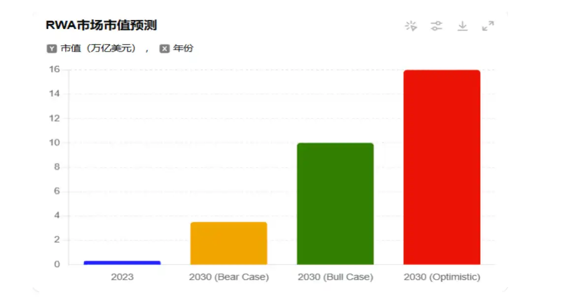 从市场规模来看,RWA 赛道的潜力极其庞大。根据波士顿咨询集团(BCG)的研究,预计到 2030 年,RWA 赛道的市场规模将达到 16 万亿美元,远超当前整个加密市场的总市值。目前,全球房地产市场的价值约 300 万亿美元,但大部分房地产投资需要高额资本,并且流动性较低,如果其中 1% 的资产实现代币化,就能创造一个 3 万亿美元 的 RWA 市场。同样,全球债券市场的规模超过 120 万亿美元,如果 1% 进入区块链,将形成一个 1.2 万亿美元 的新兴市场。