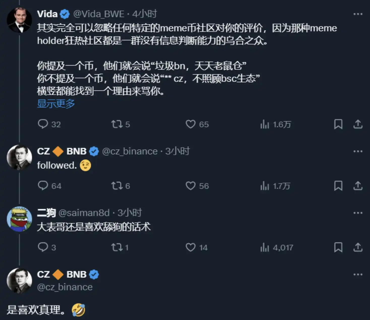 对此评价,CZ 本人也回复表示理解了,而当有社群成员评论这是 CZ 喜欢别人拍他马屁时,他本人则回应表示,自己「是喜欢真理。」
