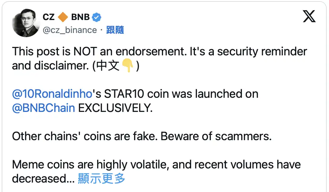 延伸阅读:CZ 转发传奇球星罗纳尔迪尼奥迷因币 STAR10 遭社群抨击,合约爆重大漏洞、疑早售出 X 账号