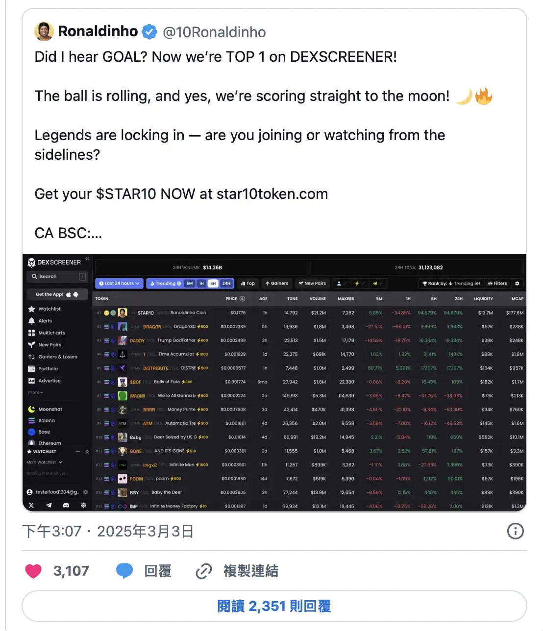 巴西传奇足球运动员罗纳尔迪尼奥(Ronaldinho Gaúcho)昨日(3 日)在 X 上发文表示,自己已经在币安链(BNB Chain)上推出了个人官方迷因币$STAR10:
