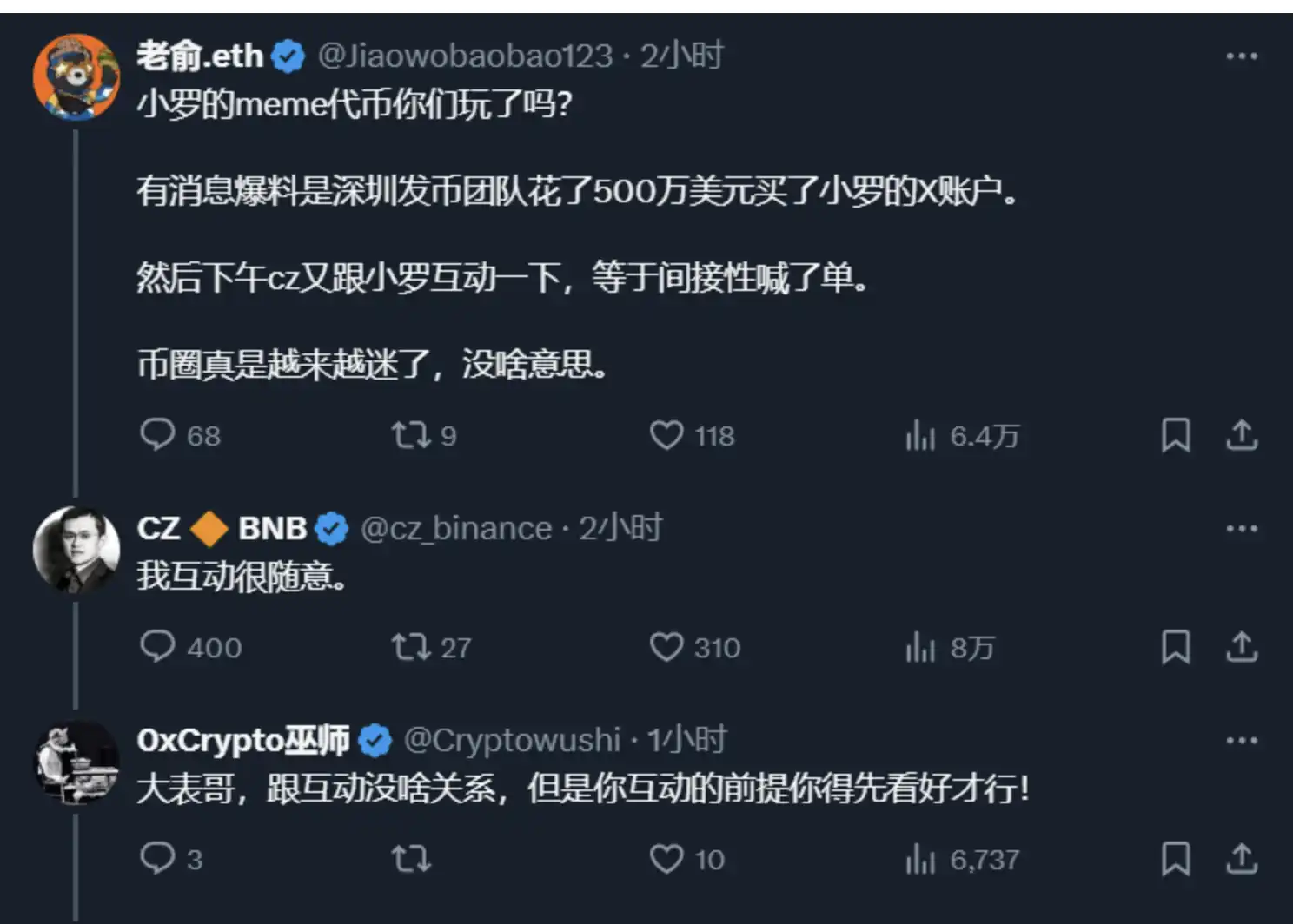 而 CZ 作为币安创始人,以及币圈最具影响力的人物之一,其在 X 平台发文与罗纳尔迪尼奥互动时,虽然有澄清自己并不是在为该项目背书,但也被社群视为一种喊单信号,质疑他不该这么做。另有人建议 CZ,在互动时应该提前做好项目背调才行。