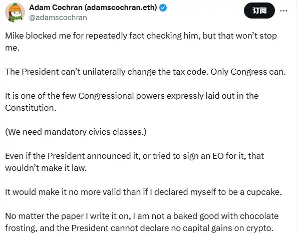 而对于 Mike Alfred 所传「特朗普准备宣布加密货币零税率」一事,Cinneamhain Ventures 合伙人 Adam Cochran 更是直接开喷:「Mike 因为我反复核实他的事实而拉黑了我,但这并不能阻止我。总统不能单方面修改税法。只有国会才可以。这是宪法明确规定的少数国会权力之一。即使总统宣布该决定,或试图为其签署行政令,也不会使其成为法律。这并不比我宣称自己是一块纸杯蛋糕更有效。」