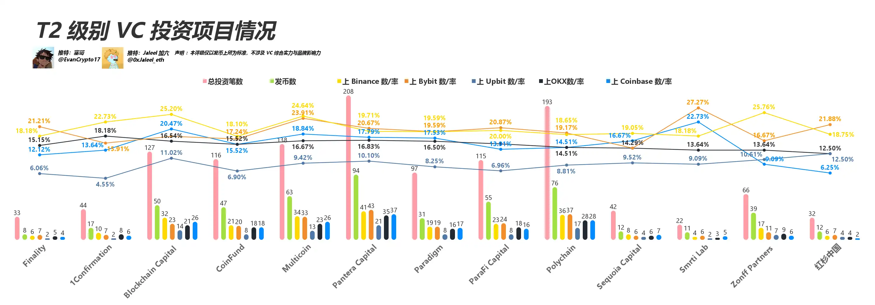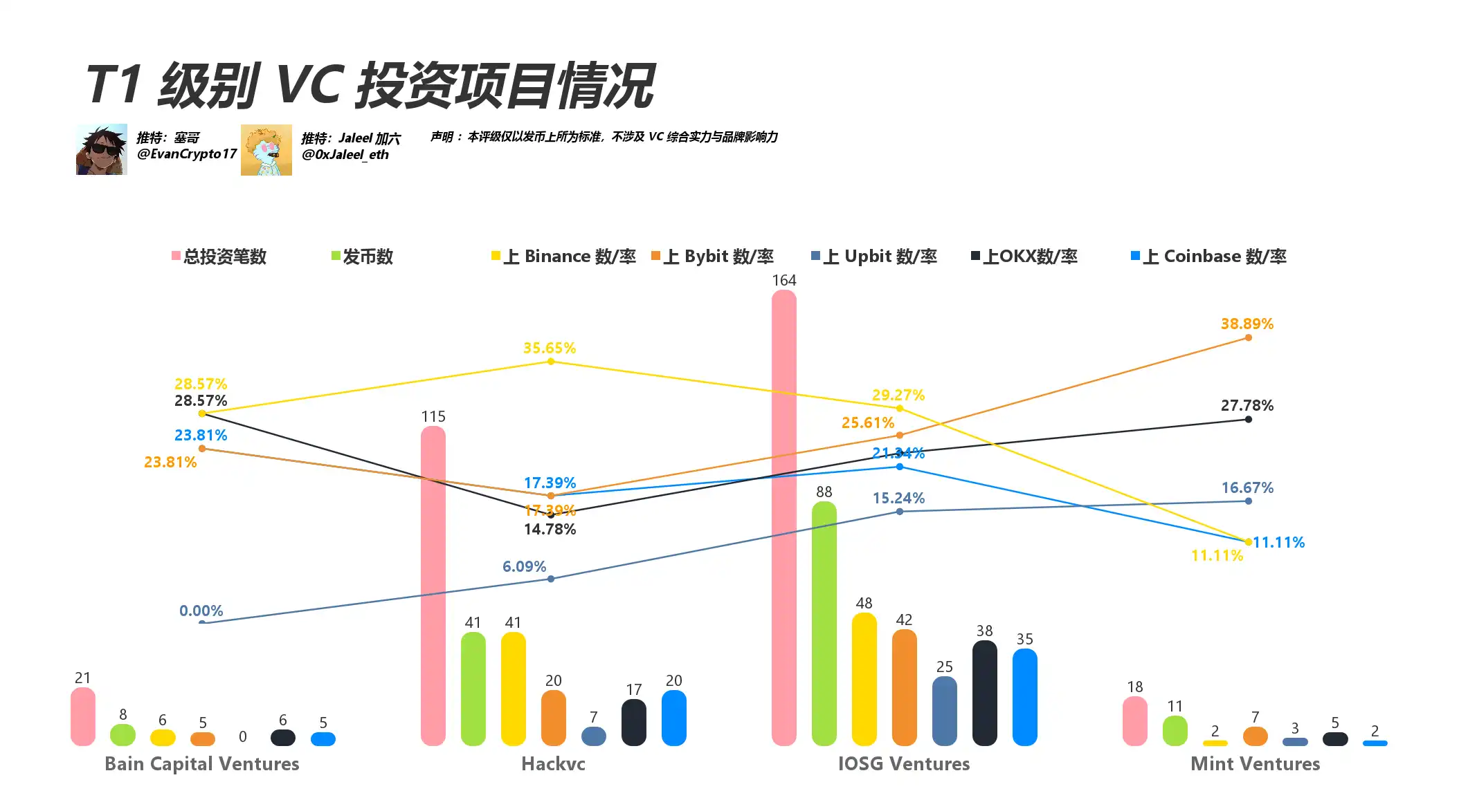 Jump Crypto、HTX Ventures(火币):有交易平台背景,但此处仅统计其被投项目在第三方交易平台上线率,因此数字未能全面反映他们真正的资源优势。