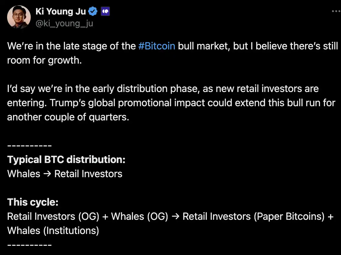 CryptoQuant 的 Ki Young Ju 就预计,比特币牛市的最终分配阶段(各类 OG 持有者和机构集中出货给最后的接盘资金)将在 2025 年年内发生。他的判断基于目前已经进入的早期分发阶段以及观察到的新散户资金涌入情况,并认为在最终出货完成前无需过早转为空头观点。