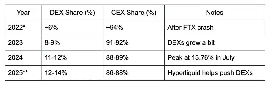 尽管 FTX 等主要 CEX 崩溃,用户交易习惯并未立即转向 DeFi。许多交易者仍然使用 Binance 等中心化平台,并非因为他们忽视了托管风险,而是因为 CEX 始终具备: