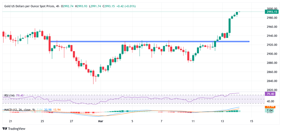 24K99讯 周五(3月14日)欧市早盘,现货黄金自高位小幅回落,目前金价位于2985美元/盎司附近;亚市盘中,金价一度触及2994.02美元/盎司,创下历史新高。FXStreet分析师Haresh Menghani撰文,对金价交易进行分析。
