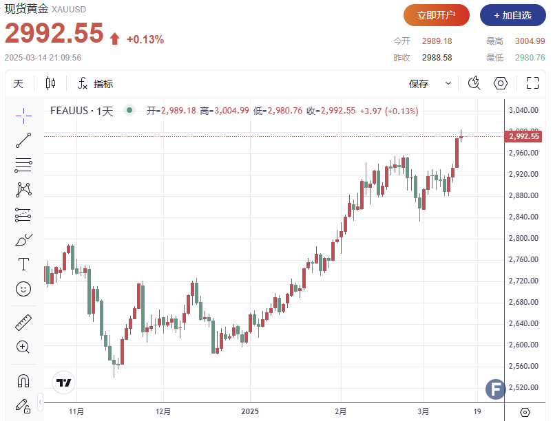 周五(3月14日),受地缘政治与经济不确定性加剧影响,投资者纷纷涌入避险资产,推动黄金价格首次突破每盎司3,000美元的心理关口。