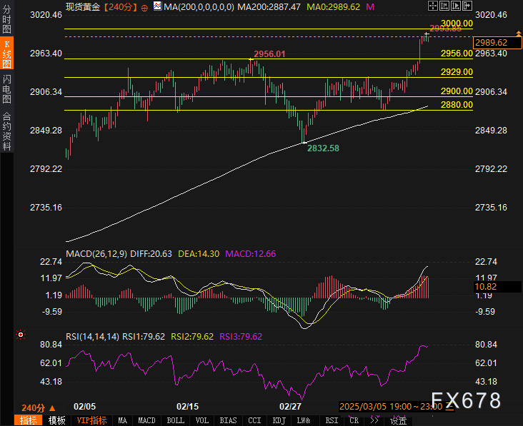 从技术面看,黄金本周的表现堪称强势。周线级别连续第二周上涨,突破2928-2930美元/盎司阻力后,一度触及历史新高,当前在2985美元/盎司附近震荡。日线RSI接近70,显示超买压力累积,短期回调风险上升。但周线趋势未变,200周期均线在2880美元/盎司附近构成强支撑,过去三个月的上升通道依然稳固。