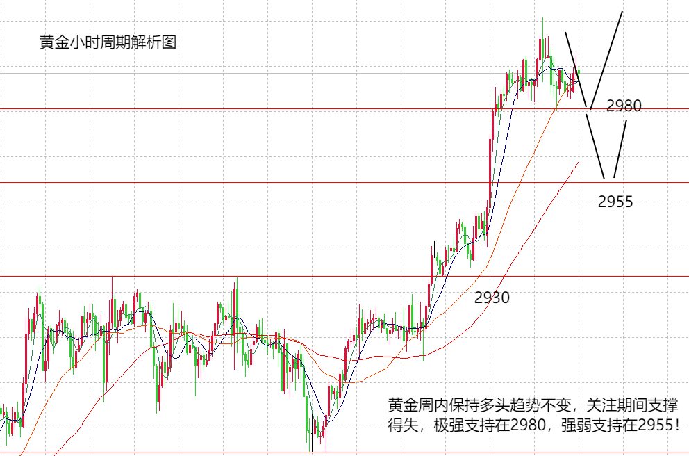 美指经历一波下跌最低在102.7附近后,一直保持震荡,虽然暂时对市场没有太大的影响,但其弱势状态一直是黄金的有利增长点,近期关注一下美元的下跌延续或者是筑底反弹,技术面周线暂时上涨的可能性,大家关注本周变化。黄金上周在多头趋势中,周初以震荡上行走高,周四,周五则在趋势中爆发出大涨空间,最大一波力度是破位前期高点2955,直接到3004高点,尽管市场有很多分析讲,在黄金突破3000后会直接上涨一波,但山海还是比较客观的提示大家不要盲目看多,所以在黄金上涨至3000后,山海一直没有给出有效交易,反而实际走势实现了山海预测回落至2977低点,由此可见,尽管市场变化较大,趋势力度明显,但在如此高价位的情况下,交易也需要谨慎对待,主思路还是等待回落做多较为稳健。本周重新建模,重新看待现在的行情。首先,必须要肯定,暂时黄金必须是多头趋势,这一点无容置疑,只要趋势不变,就必须保持两个原则,第一,上涨不猜顶,第二,回落做多,不做空。其次,虽然暂时是多头趋势,但现在价位过高,不宜随意追高,很可能每个交易日都有调整看涨的机会,所以,稳健交易的话,还是等待回落到关键点位顺势多。那么,在确定这两个思想后,从技术面研究现在的行情,日线在上周五收小十字星,这个十字星表现多空争夺非常激烈,虽然是高位十字星,但目前还看不出是顶部十字星还是延续十字星,如果是顶部十字星,还需要本周周一,周二收线的确定,至少有一个阴线收线,如果是延续十字星则需要周一,就周二再收大阳。日线上涨不猜顶,下一波或看到3030高点,日线下跌则关注2955的关键支撑点得失,如果破位2955,本周黄金会进入前期的震荡区间,再走高位震荡,下方或看至2930,甚至是2900之下,但依旧不至于改变趋势。H4周期当前也是明显强势,多头没有按下暂停键,但目前上涨还有点纠结,需要调整后再看,H4布林开口,上涨明显,布林中轨支撑也在2955附近,刚好符合日线周期的变化,同时这个点也是前期黄金的强势延续中的顶底转换点,所以,本周的关键点就在2955得失上。小周期周初关注上周无力的支撑点2980支撑,再者就是2965支撑,所以,周初黄金能确定的是多头,但什么点位做多,则还需要看亚欧盘变化。