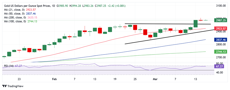 24K99讯 周一(3月17日)欧市早盘,现货黄金维持日内温和反弹走势,目前金价位于2989美元/盎司附近。FXStreet高级分析师Dhwani Mehta撰文,对金价交易进行分析。