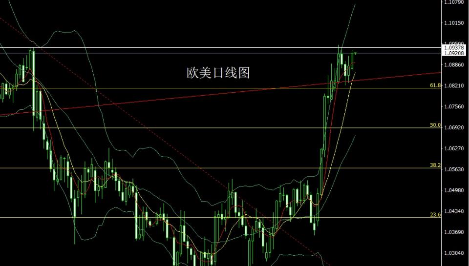 欧美市场昨日低开在1.08741的位置后行情先拉升给出1.08941的位置后行情回落,日线最低给到了1.08673的位置后行情强势拉升,日线最高触及到了1.09292的位置后行情整理,日线最终收线在了1.09206的位置后行情以一根上下影线等的中阳线收线,而这样的形态收尾后,今日1.08950多止损1.08750,目标看1.09300,破位看1.09500和1.09800-1.10000.
