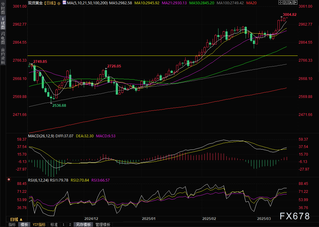 汇通财经APP讯——周二(3月18日)亚市早盘,现货黄金守在3000关口附近。金价周一上涨0.43%,历史上首次收盘于3000关口上方,收报3000.83美元/盎司,美国“恐怖数据”弱于市场预期,加剧了市场对美国经济衰退的担忧,而美国继续空袭耶伦,令市场担忧红海局势,这些都给金价提供避险支撑;不过,因为美国总统特朗普计划周二跟俄罗斯普京通电话讨论结束乌克兰战争的问题,多头仍有所顾忌。