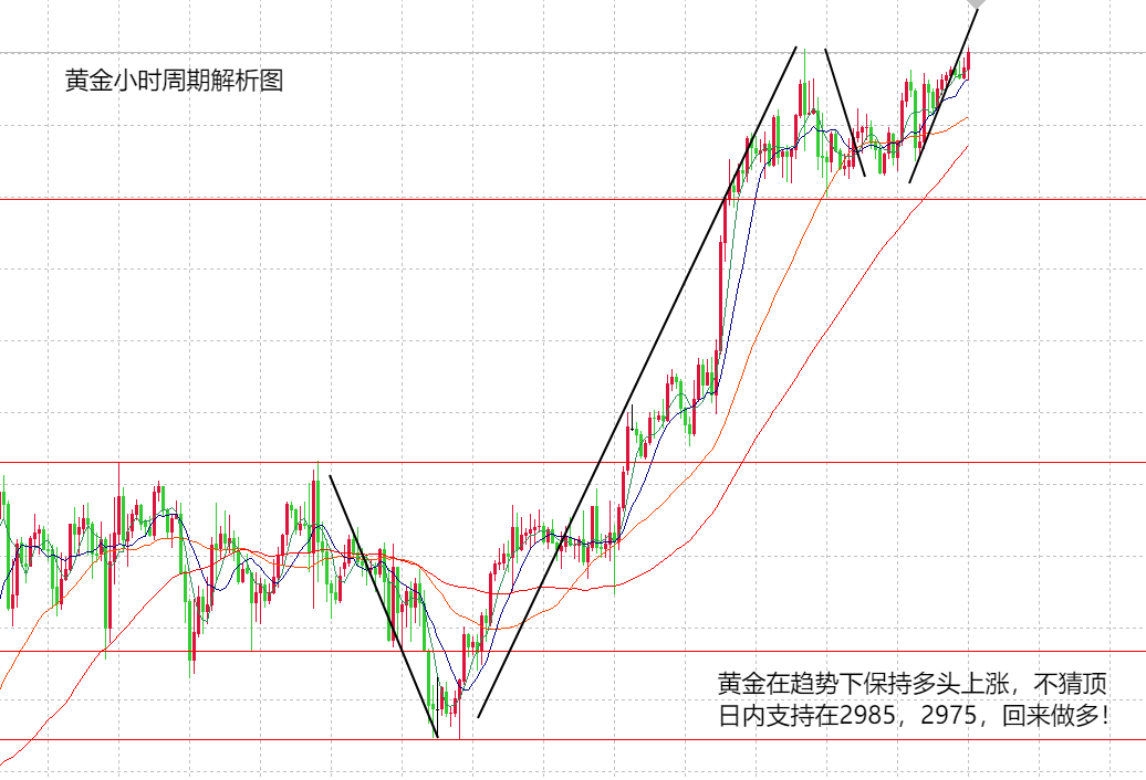 现在黄金的走势非常好看,毫无疑问是多头趋势,不管是回落后上涨还是直接上涨,整体就是上涨走势,所以,只要在未来趋势不变的情况下,就只看涨,做多单,至于上涨到哪里,暂时不知道也不清楚,不必纠结周期性顶部在哪里。周一黄金在回落到2982附近后走出上涨空间,因为全盘走势比较慢,所以直到现在才走出真正力度,目前刷新高点至3005,今天继续维持多头看涨趋势不变,依旧等待回落做多的机会。现货白银表现不是很大,目前维持在33.8附近,近期也是在多头趋势中看上市空间,虽然现在力度没有表现出来,但只要趋势不变,看涨的方向就不变。期货方面,同样的表现,沪金,融通金看涨不猜顶,上涨节奏中不追高,等待回落做多,沪银则保持小幅震荡,等待有效的上涨空间。