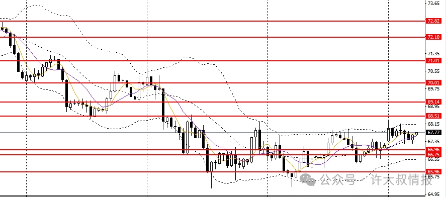 美原油收十字阳线,站上5日均线,日线RSI继续回升,4小时趋势仍偏多,67上方可延续低多思路,短线有望上探68.5附近。