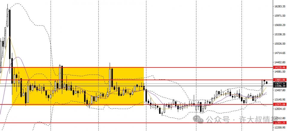A50收十字阴线,回踩日线布林上轨,日线RSI小幅回落,4小时于13800一线遇阻,多头动能减弱,如无法有效升破压力,多单建议了结。