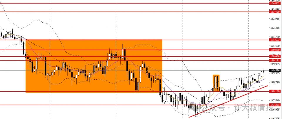 美日收锤子阳线,立于5日均线上方,日线RSI升至50左右,149成为下方关键支撑,如回踩企稳可做多,但多单建议谨慎持有,如无法升破150.2,多单可离场。