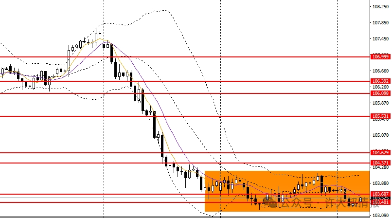 美元指数再度收阴,重新承压于5日均线,日线RSI继续回落,4小时逼近103-104震荡区间下沿,如守住103关口,短线预计将维持低位震荡,如失守103,后市有望下探102.7附近。