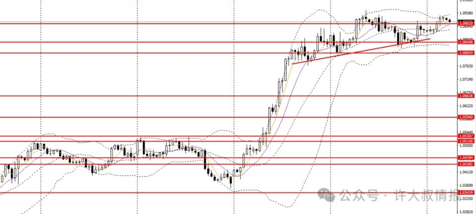 欧美继续强势上行,逼近前高,日线RSI接近超买区,4小时位于上行趋势线上方,短线走势仍强劲,多单可继续持有,上方重点关注1.0950一线阻力,如无法有效升破,多单可暂时离场。