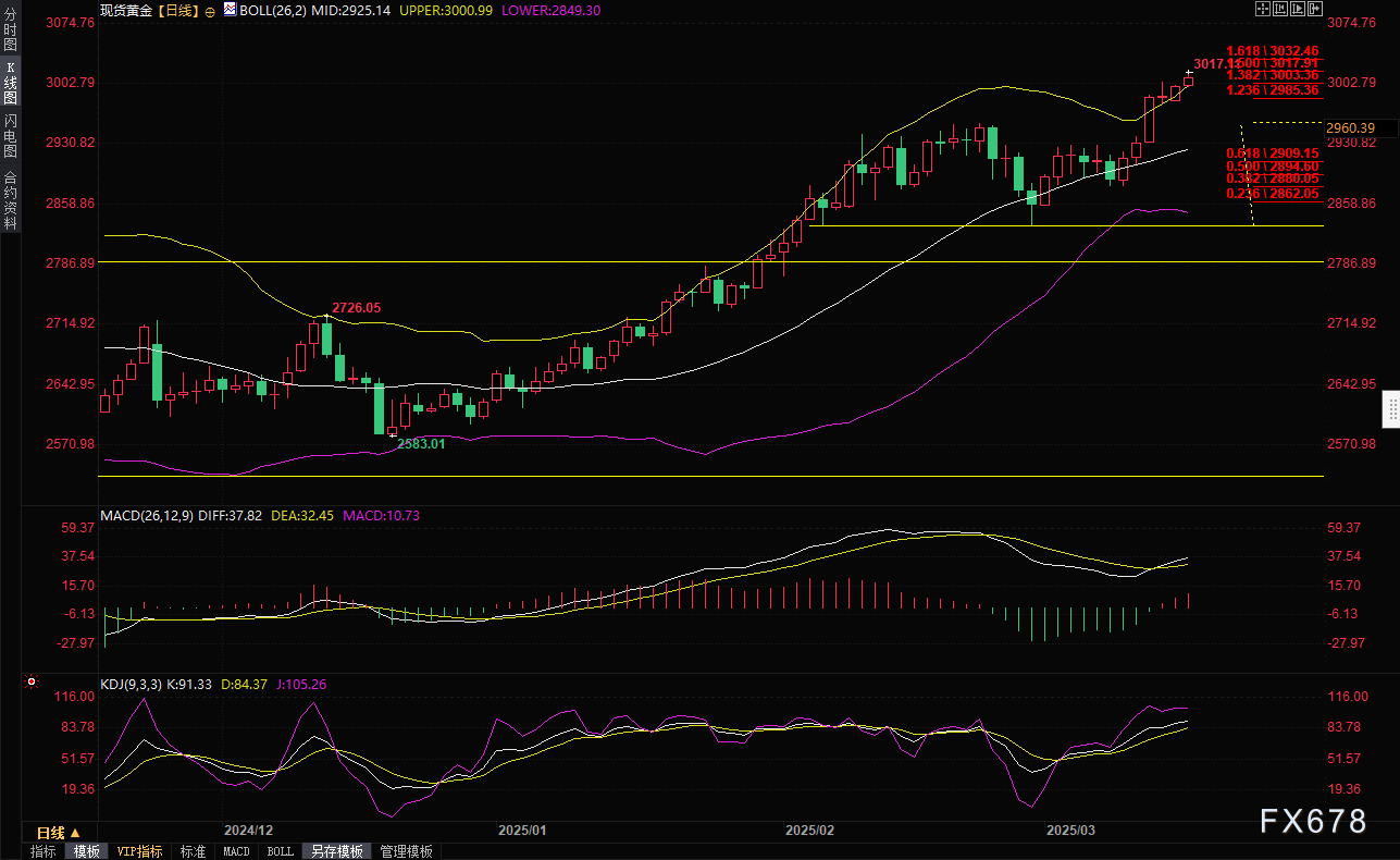 现货黄金周二亚市延续涨势,目前上涨0.35%至每盎司3011.35美元,此前盘中一度触及3017.11美元的历史纪录高位。这是金价在一周内第二次突破3000美元大关,上周五首次突破这一里程碑。Marex分析师Edward Meir指出,美元走软和关税不确定性是金价上涨的主要驱动力,技术性买盘也因缺乏明显阻力而加速。