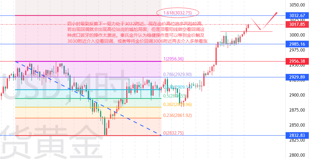 现在金价处于高位,如追多出现回调容易出现高位站岗的局面,这种操作风险较高,老秦不是很建议,但是如果顶着阳线去看回调这种虎口拔牙的操作也偏激进。秦氏金升个人建议是可以等待金价触及3032附近去布空看回调,下方触及3006附近去接多继续看上行。