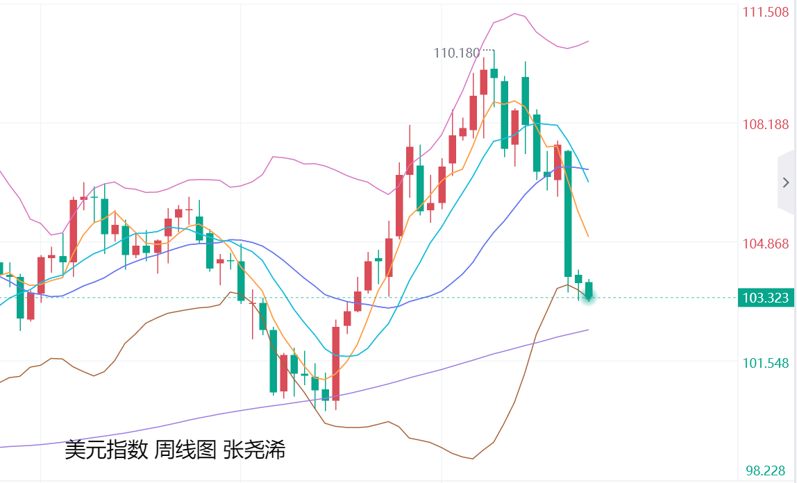 另外,美元指数,日图仍稳健运行在200日均线下方,且走势还受到短期均线压力,空头占据优势,暗示后市走势以回落走低为主,而会对金价产生支撑,再者周图也依托布林带下轨连续走低,附图指标维持明显的空头信号,将有望进一步走低触及200周均线支撑位置,而会在此期间对金价产生支撑。