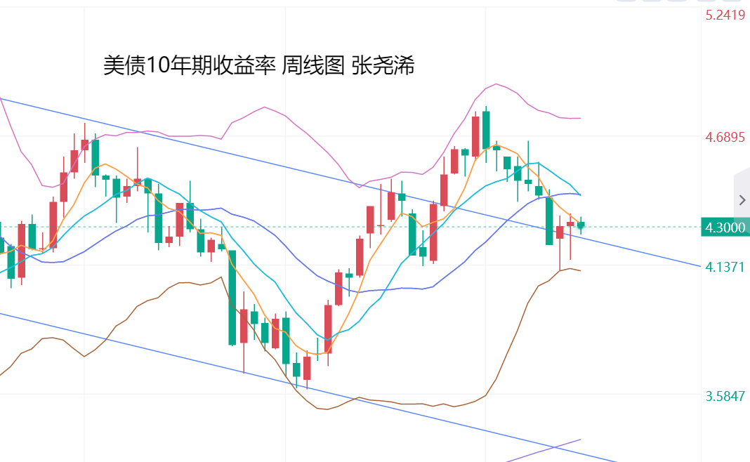 美债10年期收益率,日图近日维持横盘震荡,并处于200日均线上方,走势偏筑底转回升的预期,但目前仍处于回落趋势中,周图走势也虽连续触底回升,有止跌转反弹的倾向,但目前走势也仍运行在中轨下方,多头未能再度转强,故此对于金价的压力有限。