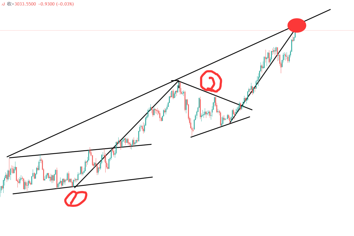 我对这两次上涨印象极深,因为都是做中了开头,没做对结尾,第一波是年前我刚开始筹备在通道内做多,然后破位后看反跌失败,不要用马后炮视角问我为什么破位了看空,第二波就是这次内敛三角形了,也是开始从下往上看,到最后2960开始看跌败北,归根结底都是在牛尾巴上被冲退的,然后接着续牛,所以我就索性把两次续牛上涨做了拓展。
