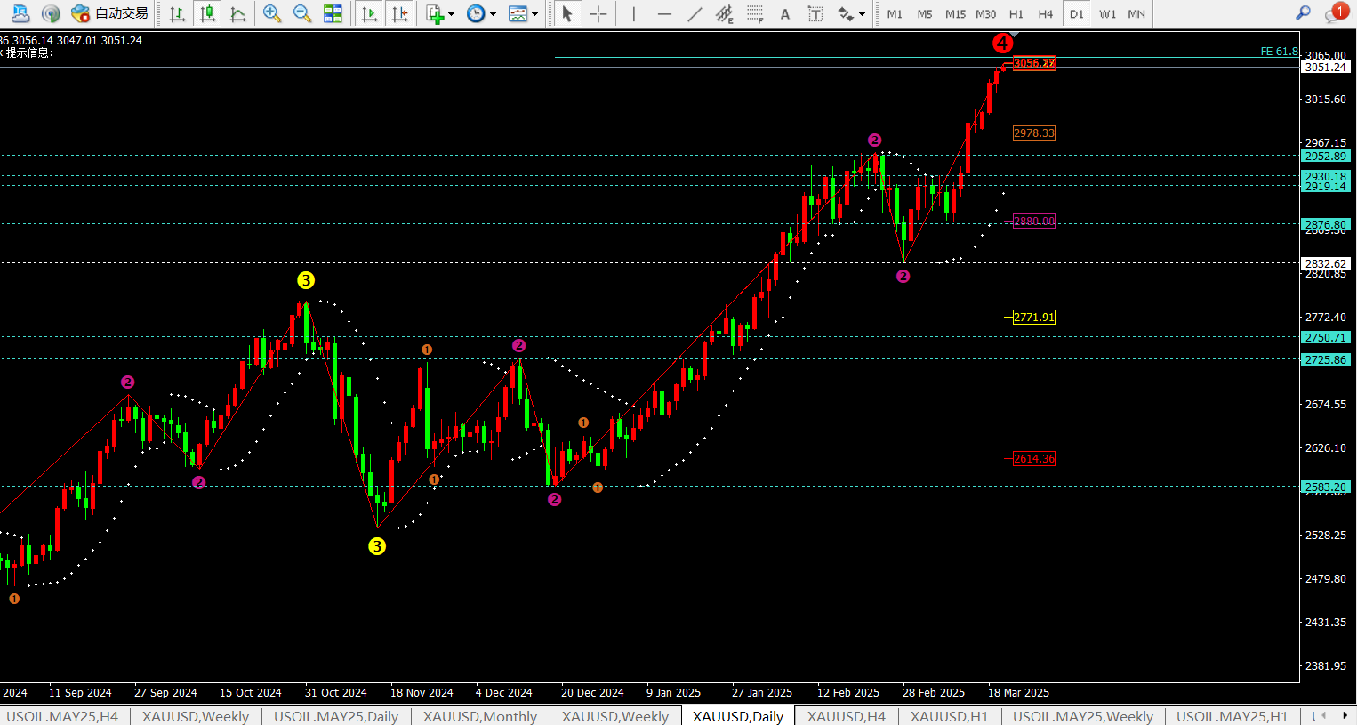 目前黄金上涨接近预测顶部,所以高位追多得当心必须严格止损。目前就等大周期的做空信号出现。短期下方关注3038和3024附近的支撑,下破将开启回落。