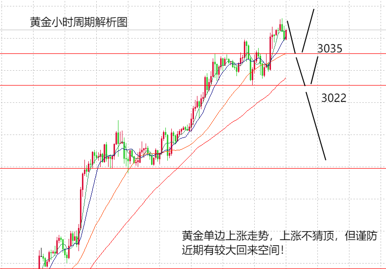 美指在午夜先涨后跌,整体是下行走势,所以暂时仍然保持在103低点附近震荡,虽然有底部形态,但没有上涨力度,所以,现在跟黄金的走势相反,虽说有顶部背离的状态,但没有较大调整的力度。地缘局势影响是黄金近期上涨的必要条件。最近山海对黄金的看法还是保持之前的观点不变,在极强多头趋势中,继续看上涨空间,但需要注意,随时都有极大的调整空间,所以,维持前期的思路,看涨不追高,可以在每日的顶点位置尝试性做空,看一下每日的具体调整力度,以及是否破位关键支撑点位。按照主思路来看,今天黄金的支撑点关注两个点位,一个是小周期的支撑点3035,一个是日线的单边均线支撑3022,在极强走势下,黄金不破3035,可以顺势做多,上方高点不猜,先看3055前面高点,破位后继续上看,但在破位3035后,就要注意,可能在周期出现较大调整至3022附近,这个价位是否破位也相当重要,日线单边均线支撑点和H4布林中轨的关键点,都在此,破位后黄金方可看有效的大跌空间,甚至可以跌至2980低点,但是不破,在极强多头趋势下,不要幻想黄金的调整力度,因此,这个周期黄金可以看涨,可以做多,都没有问题,但一定是等待有效调整做多,看涨。另外,大家都不说,但是山海要提示大家,日线周期随时都有较大调整空间,只要日内出现第一次高点,第二次试探不破均可尝试性做空,近期黄金日线收阴就会短期见顶出现大跌,所以,近期黄金继续坚持看涨,但也要谨防较大的调整空间,大家不要无脑做多,掉以轻心。