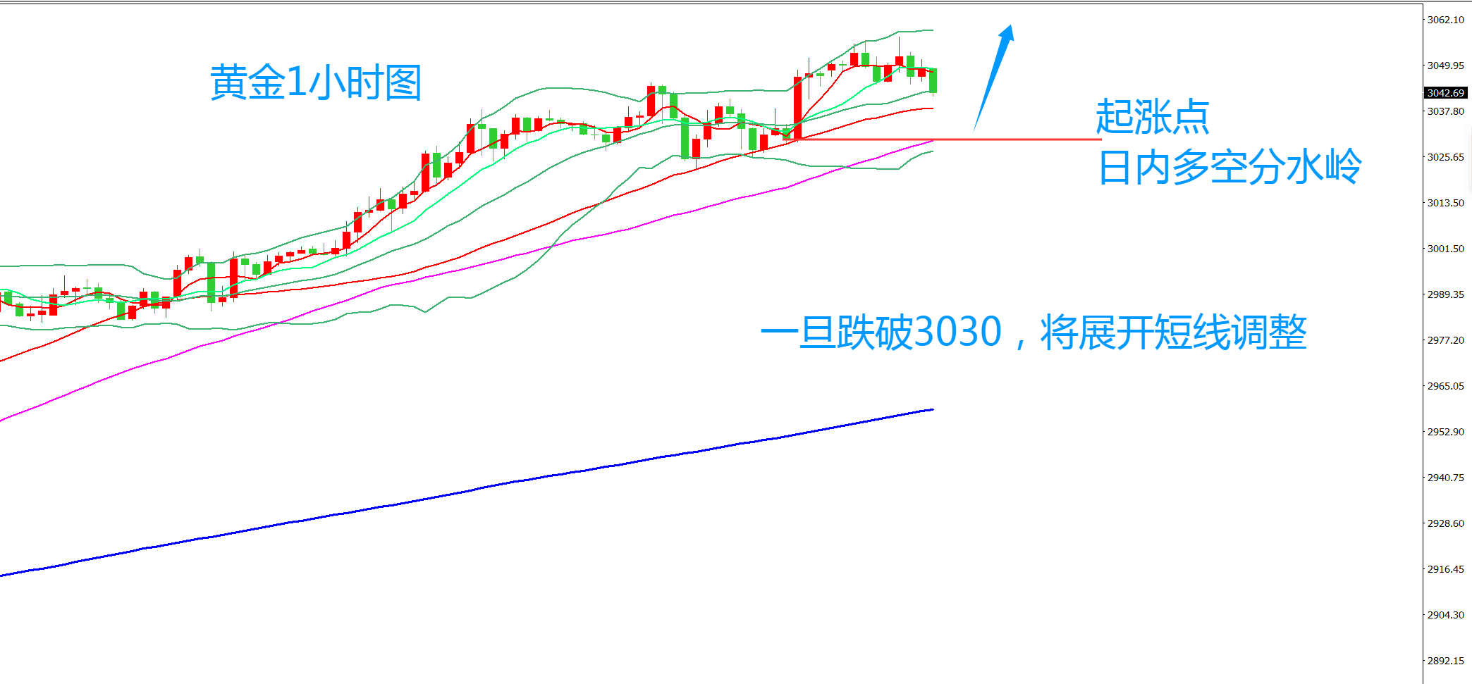 目前的做多,以日内为主,没有出现四五十美金的回撤之前,就不要考虑波段多了,若日内一旦跌破3030——3025区域支撑展开回调,就确定短线将展开调整,做多位置则要调整到3000附近。所以,目前这个位置,上方空间不大,下方空间也不大。