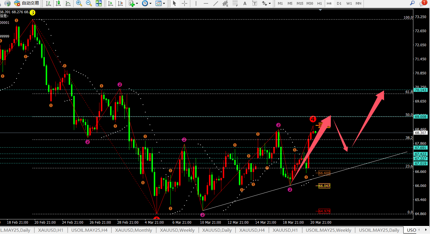 目前上方关注68.9-70.2压制,这也是开空的地方,目前等待现价提示。