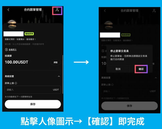 点击右上角人像图示→【确认】即完成币安 跟单取消